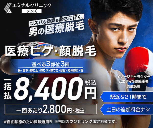 「ヒゲ脱毛は激安だけど全身脱毛のプランが高い...」というクリニックも多い中、エミナルクリニックメンズはヒゲ脱毛はもちろん、全身脱毛の料金も安いのが魅力。ヒゲ以外の部位の脱毛に少しでも興味がある方は、エミナルクリニックメンズへGO!